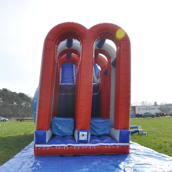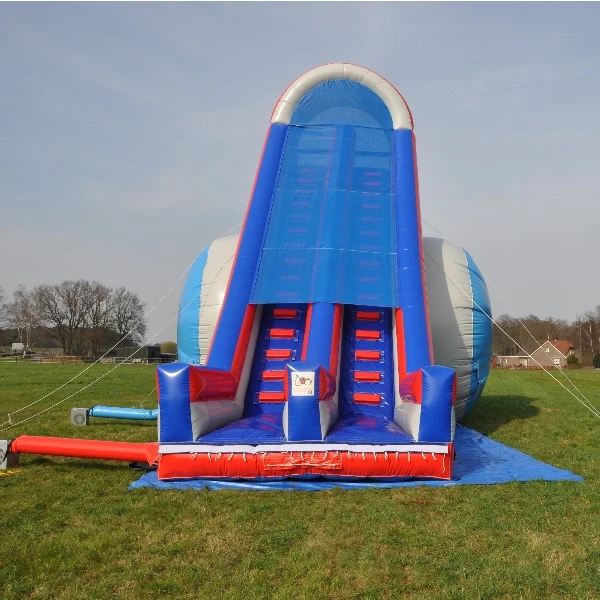 Durf jij het aan? Met de Air Slide voeg je gegarandeerd spektakel toe aan ieder evenement! Deze gigantische dubbele schans is dé attractie voor waaghalzen die van actie en snelheid houden. Klim omhoog, neem een aanloop en glijd als een raket naar beneden – recht het luchtkussen in. Met twee glijbanen naast elkaar is het extra leuk om tegen elkaar te racen. De Air Slide is een indrukwekkende eyecatcher en een absolute favoriet bij zowel kinderen als tieners en volwassenen.