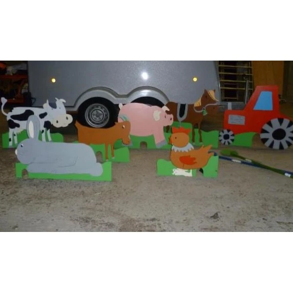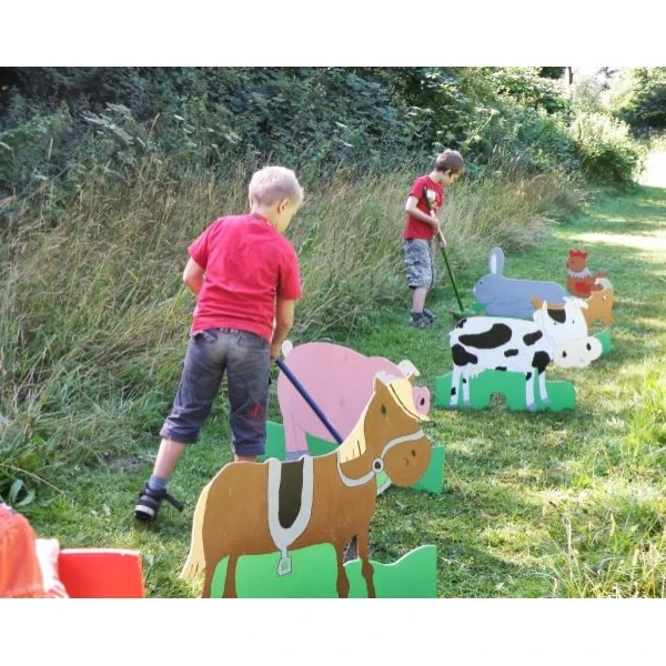 Zet willekeurig de boerderijdieren neer en probeer de golfbal door de poortjes van de figuren te spelen.