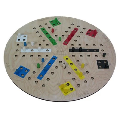 Ronddraaiend berkenhouten multiplex speelbord, 100 cm doorsnee met 30 pionnen in 6 verschillende kleuren en een grote dobbelsteen. Probeer jouw pionnen als eerste allemaal weer 'thuis' te laten komen (en ondertussen je tegenstanders van het bord te spelen).