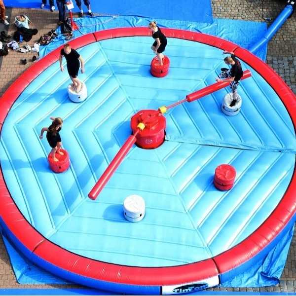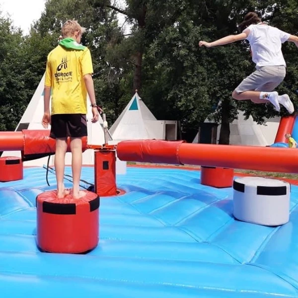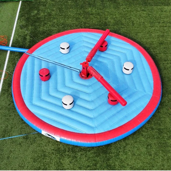 De eerste zeskamp Striker van Nederland, alleen te huur bij attractieverhuur TimTom. Met zes personen tegelijk gaat u de uitdaging aan om de roterende balken te verslaan. Wie het langste blijft staan, verslaat zijn medespelers. Dit is een nieuw zeskamp spel waarbij uitdaging en plezier voorop staan. De zeskamp Striker is ontwikkeld van kwalitatief hoogstaande materialen. De uitstraling van de Striker geeft uw evenement kleur. Het huren van de zeskamp Striker is een gegarandeerd succes!