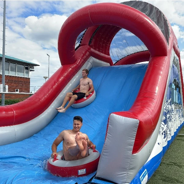 De titel geeft een exacte beschrijving van deze nieuwe waterattractie van attractieverhuur TimTom. De WaterRoll stormbaan is een uitdagende water stormbaan met verschillende elementen. De stormbaan begint met een het klimmen via een trappetje naar boven, via een smalle doorgang glij je weer naar beneden. Er staat direct de volgende obstakel klaar, namelijk de MegaRoll. Spring hierna door de ringen en probeer zo snel mogelijk door de muren heen te komen. Je hebt het eerste gedeelte overleefd, nu de Tobbedans nog. Deze stormbaan begint met een steile beklimming, waarna je vervolgens hard naar beneden gaat in een groot waterbad! Let op: de Water Roll Stormbaan is niet geschikt voor mensen die droog willen blijven!